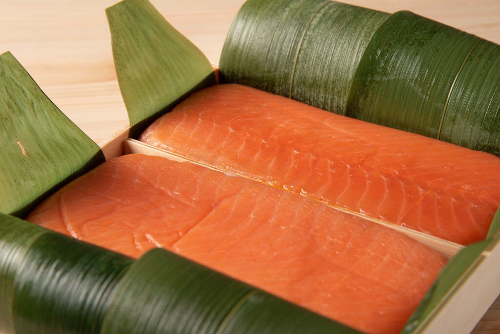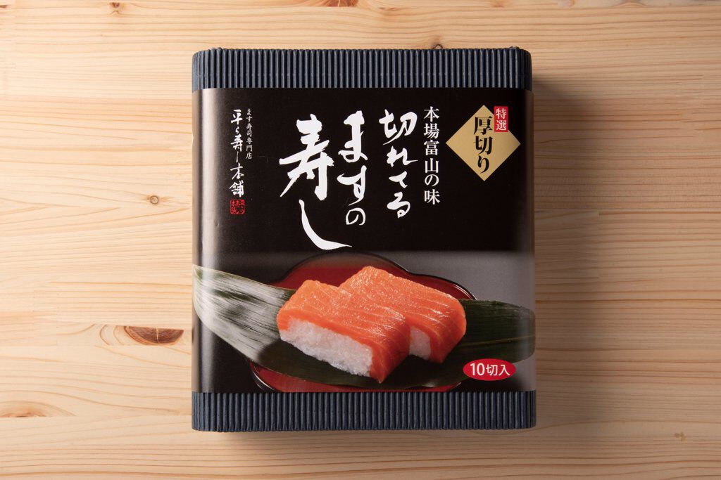 厚切特選一重を10切入りの「切れてるますの寿し」としてさらに食べやすくしました。 味も少しだけ手を加え上品な味わいにして、笹も上質のものを使用した「極上のますの寿し」です。